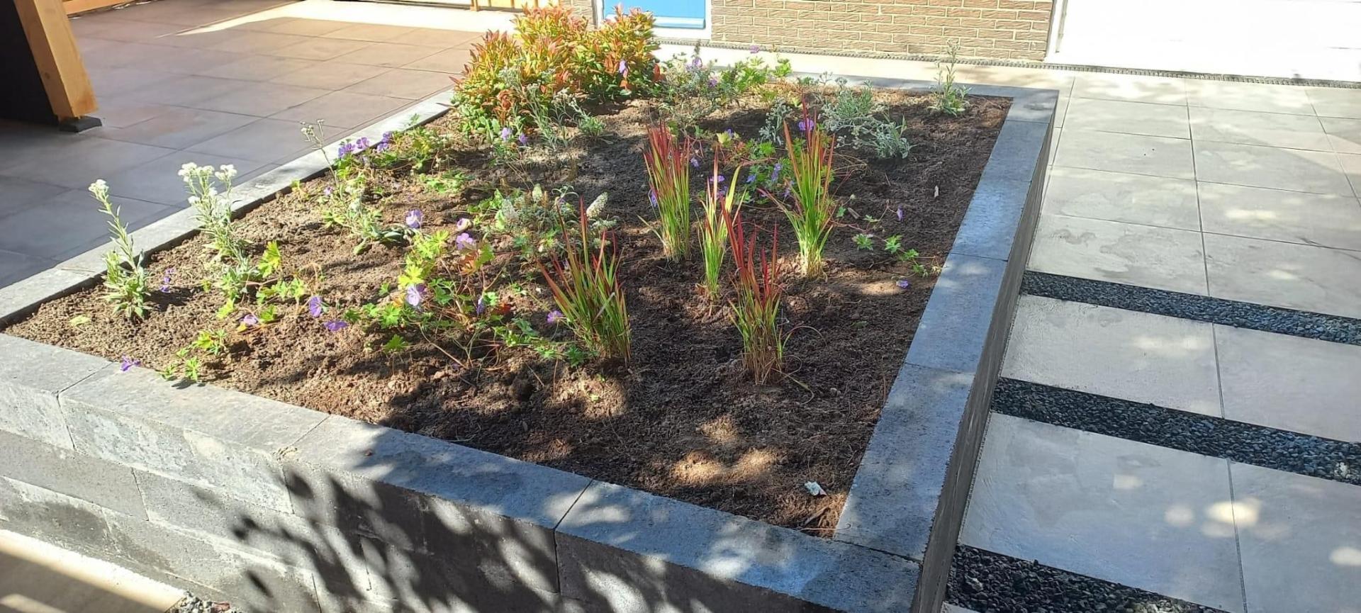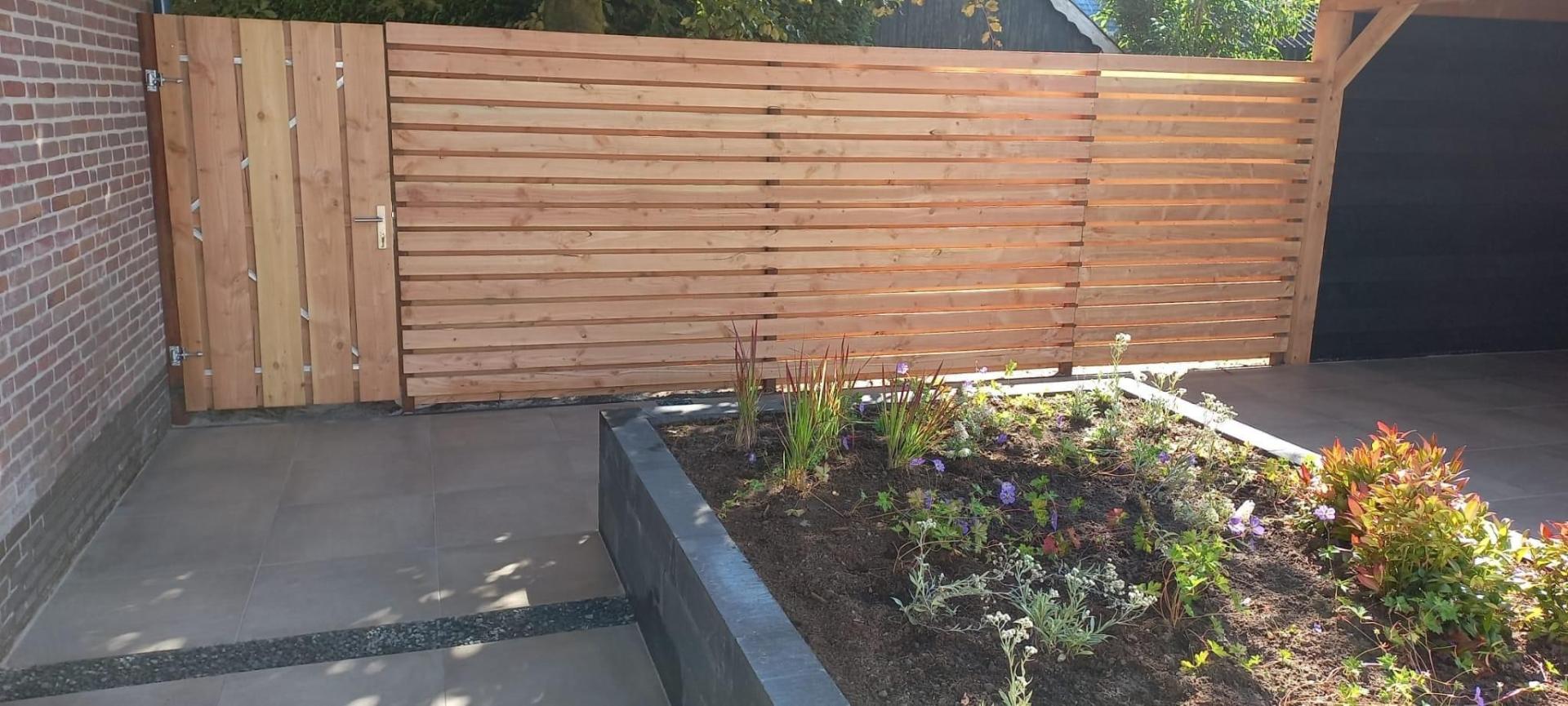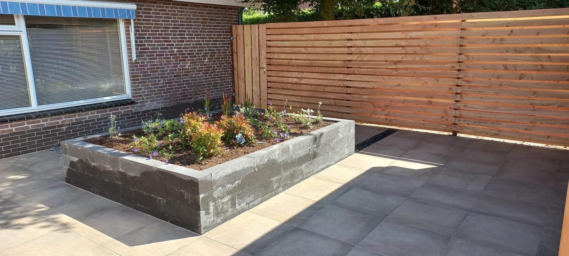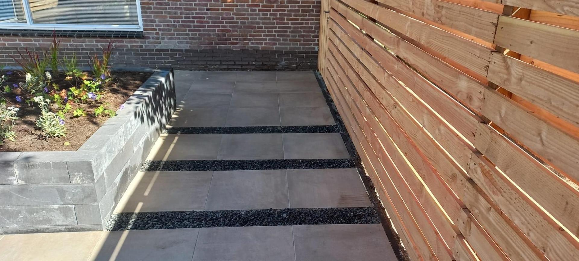 Keramische tegels en stapelblokken geleverd voor achtertuin in De Westereen.
